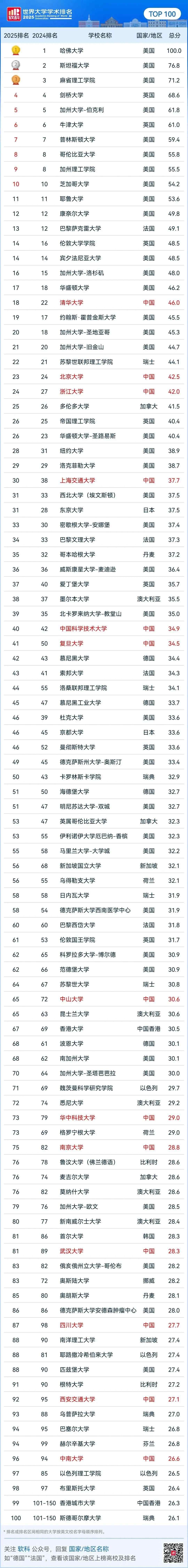 2025软科世界大学学术排名前100。图/软科