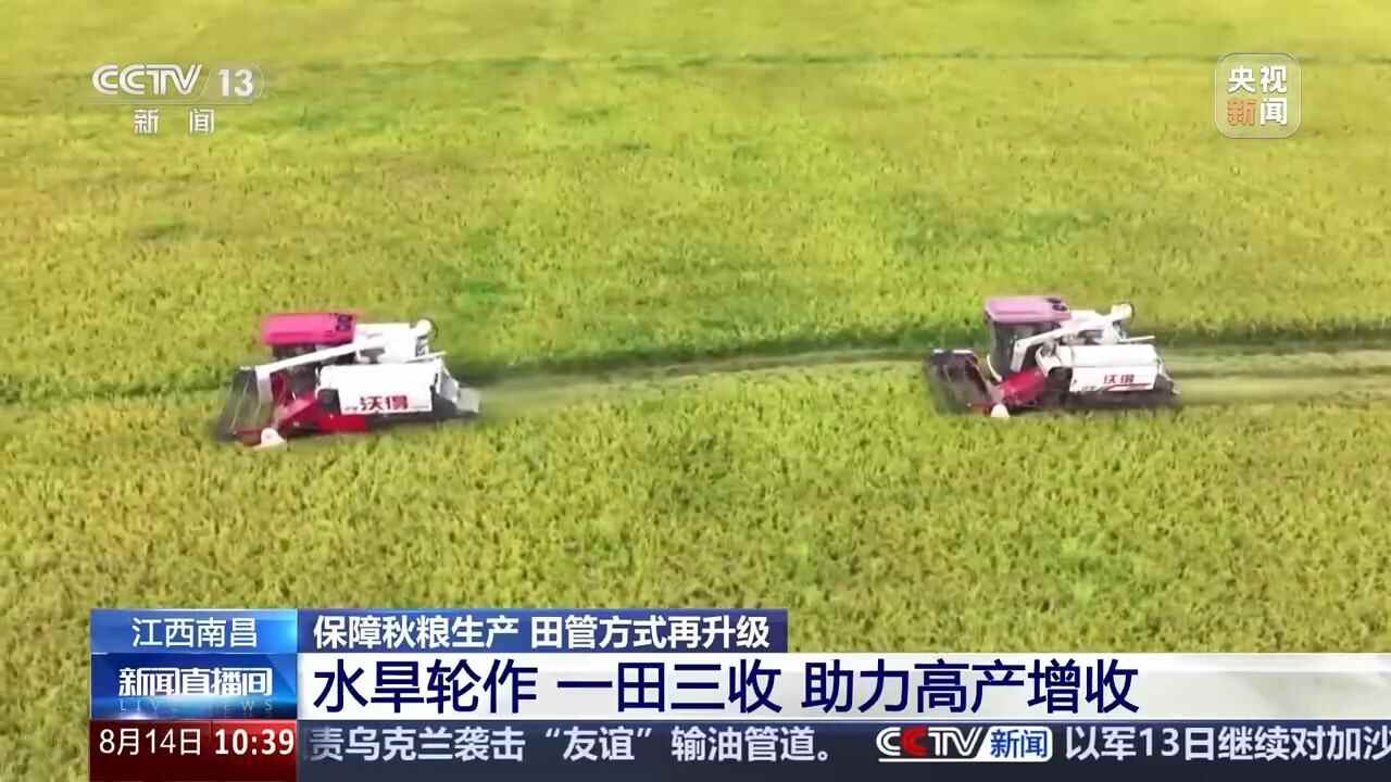 在江西南昌联圩镇,一茬茬饱满的稻穗被迅速收割、脱粒,装入运输车辆。而在收割机作业的田块旁,翻耕起垄机正加紧作业,农户们忙着清沟除杂、整理田地,为播种优质高产大豆做足准备。今年当地采用水旱轮作、一田三收的种植方式,春季种水稻,初秋收完水稻后抢种大豆,秋末大豆收获后紧接着种植耐寒蔬菜或油菜,三季作物茬口紧密衔接,全年无闲田。同时,通过推广良种、测土配方施肥等技术,确保每种作物都能优质高产。