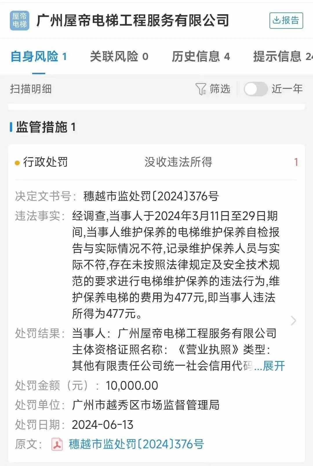 另据企查查信息,广州屋帝电梯工程服务有限公司曾于2024年6月被越秀区市场监督管理局作出行政处罚,罚没款合计10477元,违法事实为维护保养自检报告与实际情况不符,记录维护保养人员与实际不符。