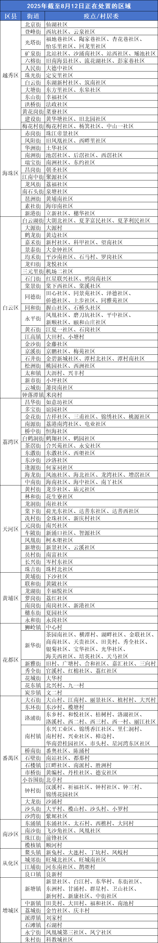 当前已进入登革热等蚊媒传染病流行季节。广州疾控提醒您,截至8月12日,以下区域正在开展蚊媒传染病疫情处置,存在传播风险,请注意防蚊灭蚊。