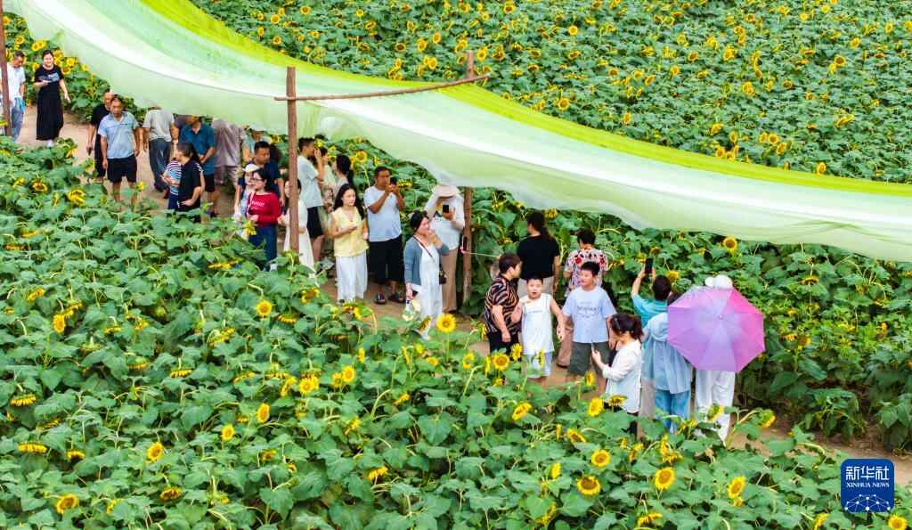 8月12日,游客在河南省驻马店市西平县老王坡产业融合发展示范区的百亩油葵花海游玩。
