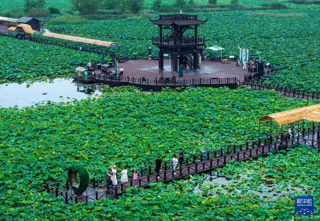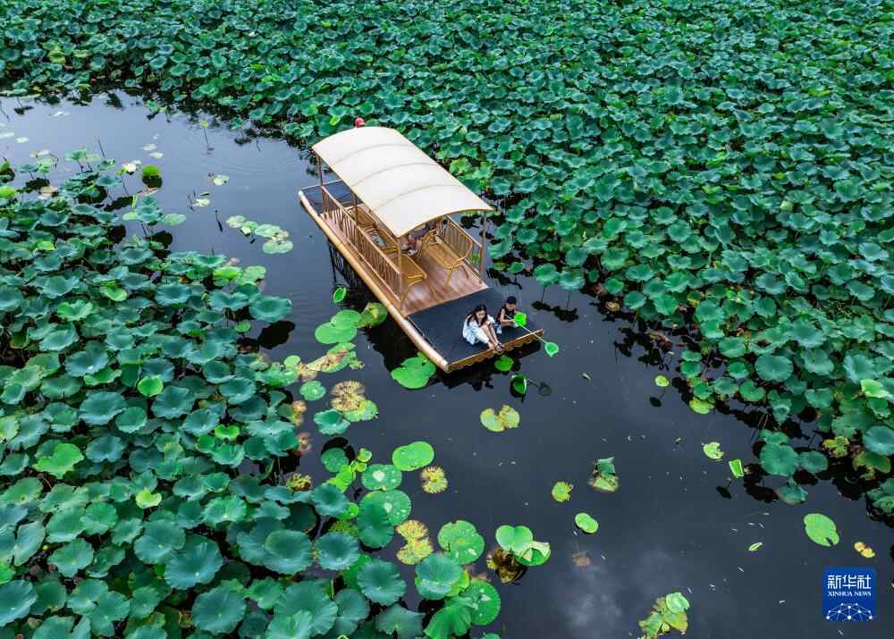 8月13日,游客在江苏省兴化市万亩荷塘景区赏荷游玩(无人机照片)。