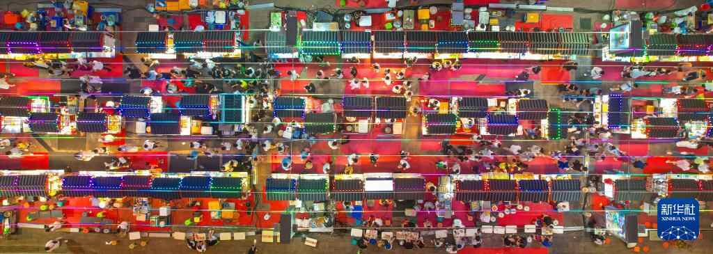 8月12日晚,人们在山东省青岛市李沧区李村夜市逛市集、品美食(无人机照片)。