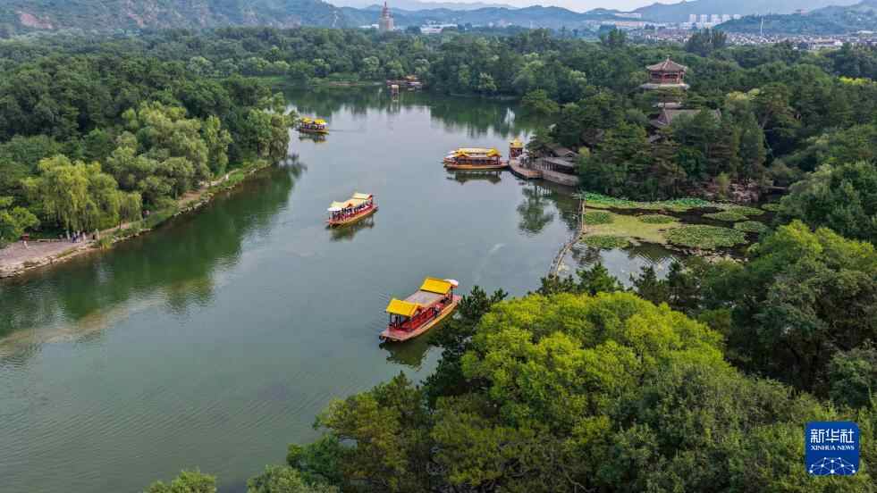 8月12日,游客在河北省承德市避暑山庄景区游玩观景(无人机照片)。