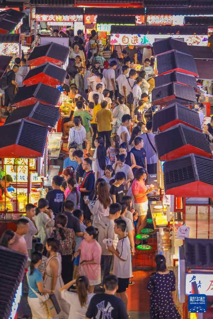 8月12日晚,人们在山东省青岛市李沧区李村夜市逛市集、品美食。