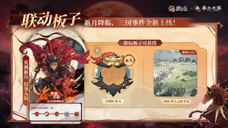 全新率土之滨联动新月事件板子开放,经典三国事件加入板子,邀你以身入局!草船借箭让被狼队爪击出局的好人阵营玩家可以获得一把猎枪;“凤仪亭”公布后,只能选择狼美人相邻的存活玩家进行放逐。玩家们可以在虚实难辨的计策中,体验三国谋略精髓。活动期间游玩板子即可获得联动头像框及限时游戏场景,还有更多好礼相赠。
