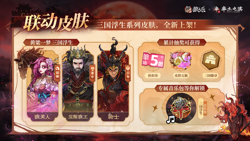 联动皮肤惊喜来袭,狼人杀经典角色梦回三国,化身三国武将,狼美人变身为貂蝉,闭月之姿暗藏致命魅惑,骑士化为吕布,手持方天画戟寒光凛冽,一骑当千守护信仰,觉醒狼王化为董卓,尽显枭雄本色,威慑全场。活动期间开启三国浮生系列皮肤宝箱即有机会获得,还有“三国浮生”音乐包等你来拿。