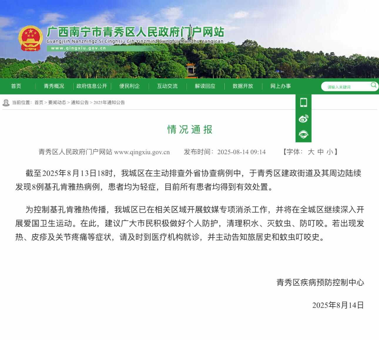 广西南宁市青秀区8月14日发布通告,截至2025年8月13日18时,南宁市青秀区在主动排查外省协查病例中,于建政街道及其周边陆续发现8例基孔肯雅热病例,患者均为轻症,目前所有患者均得到有效处置。