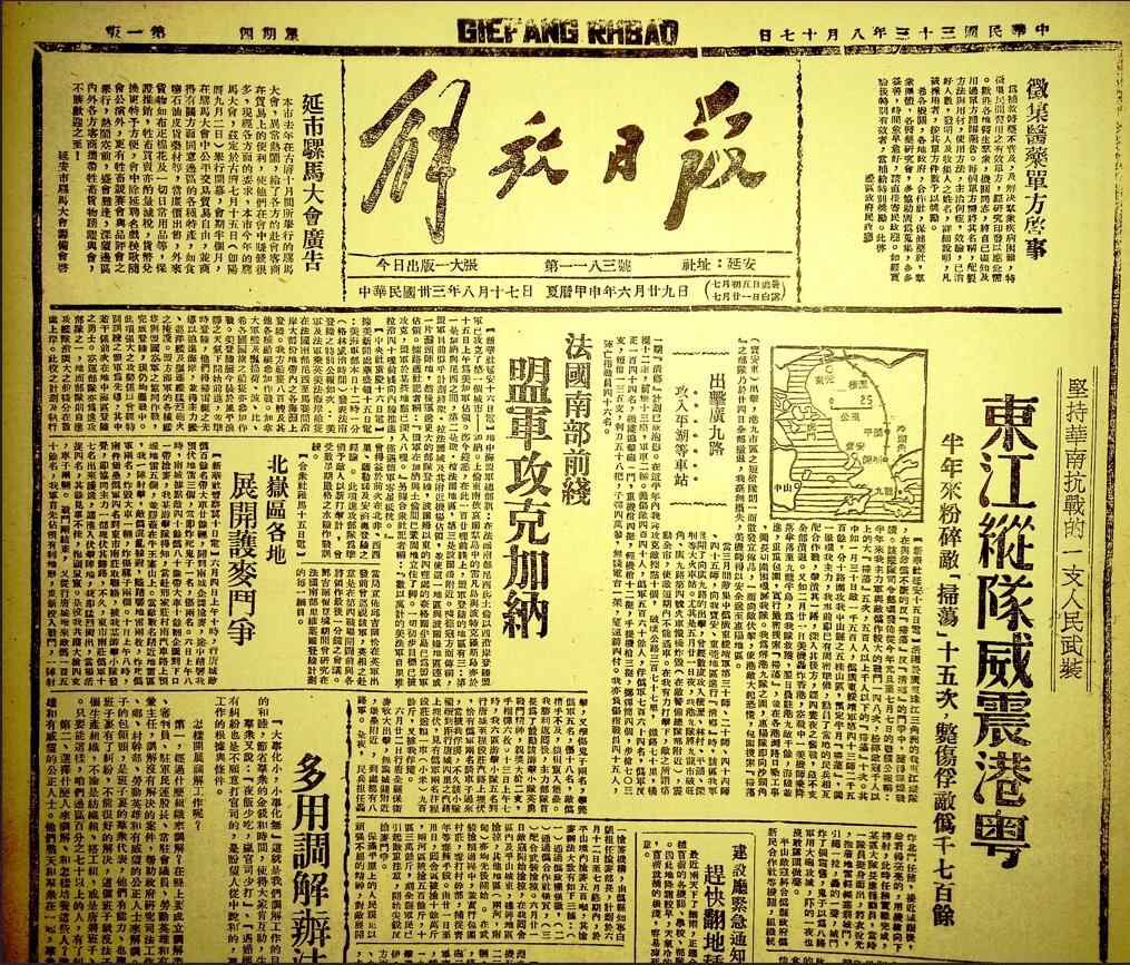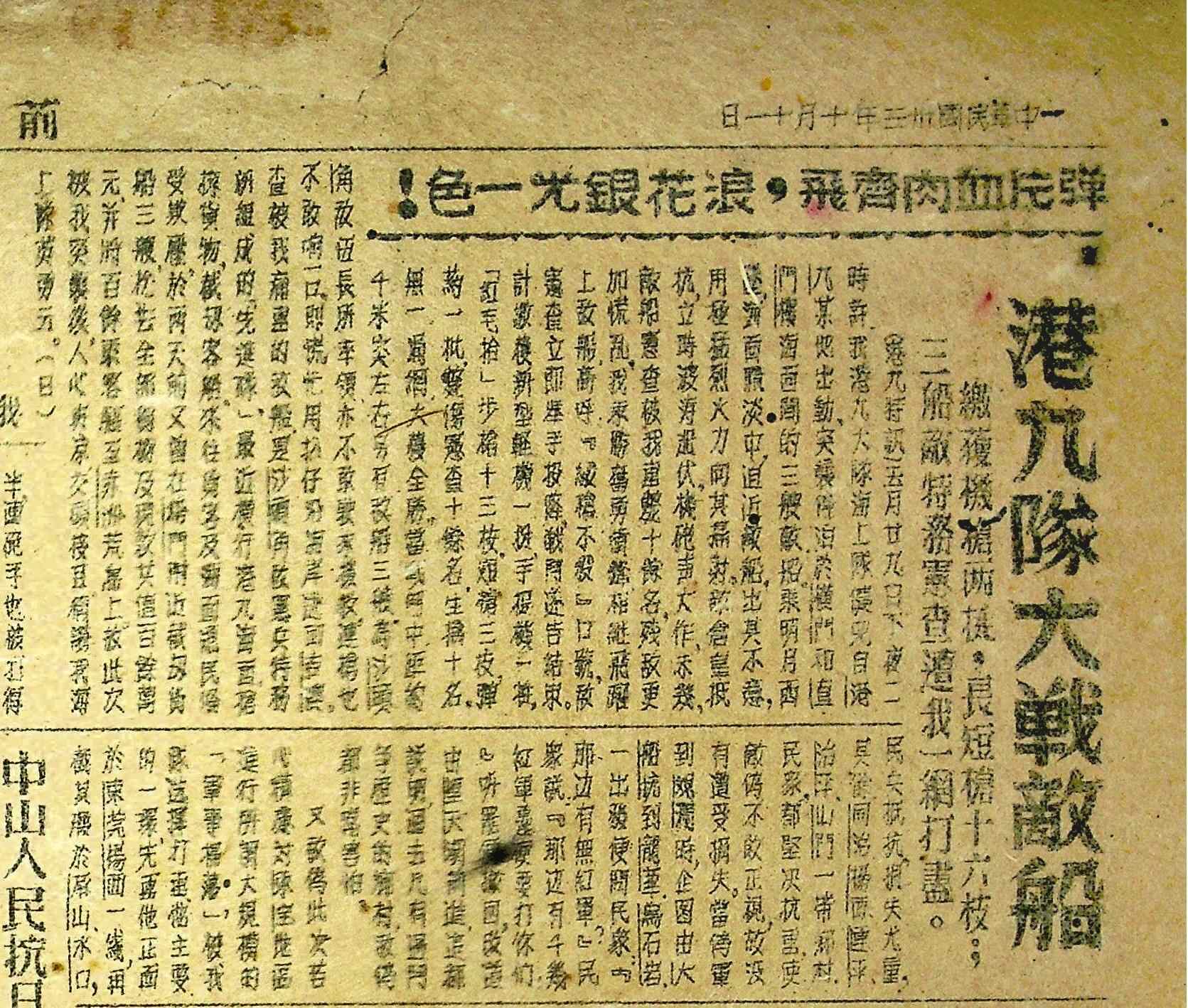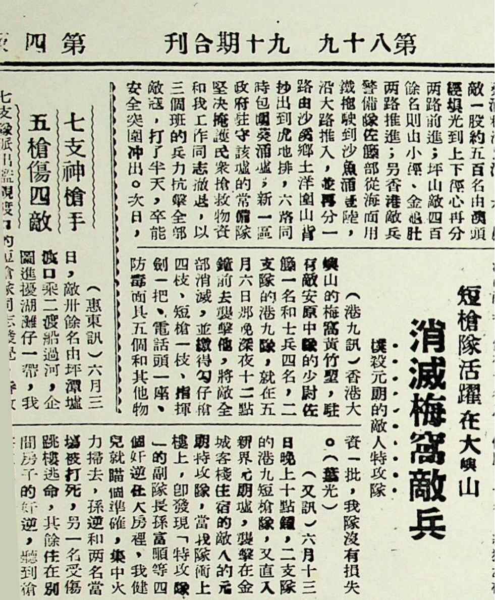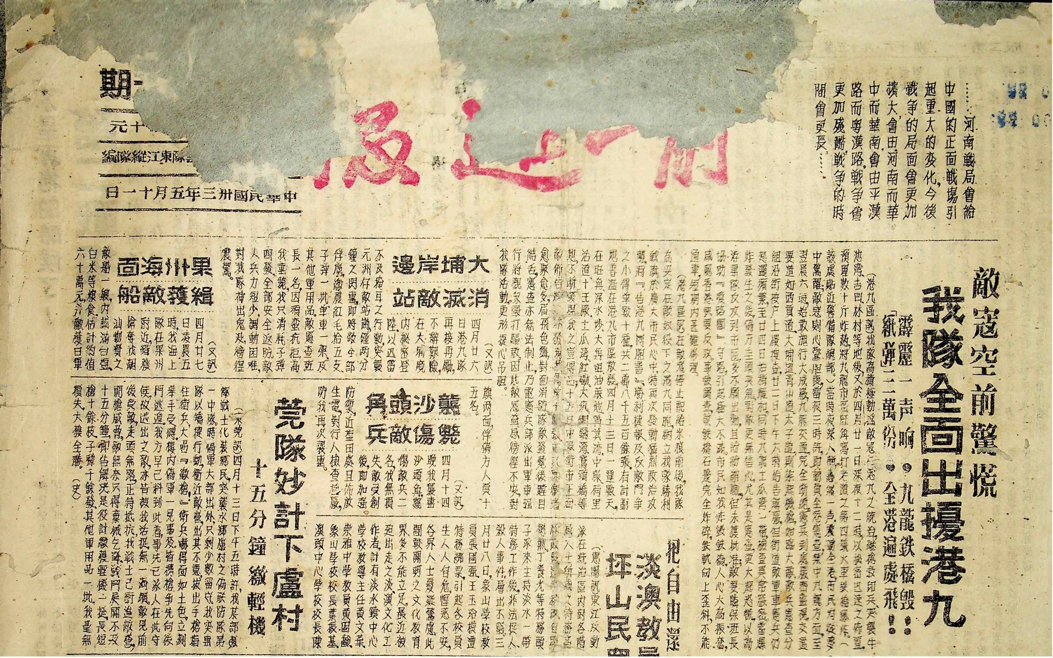 东江纵队是在抗日战争时期,中国共产党在广东东江地区创建和领导的一支人民抗日军队,是开辟华南敌后战场、坚持华南抗战的主力部队之一。广东省档案馆馆藏1944年8月17日《解放日报》的头版《东江纵队威震港粤》,全面报道了东江纵队在港九地区的彪炳战绩:“尤其是五月廿一日夜,我港九队将九龙市破旺角、广九路第四号火车铁桥炸毁(在敌警备总队部附近),震动全市,使敌短期内不能通车”。
