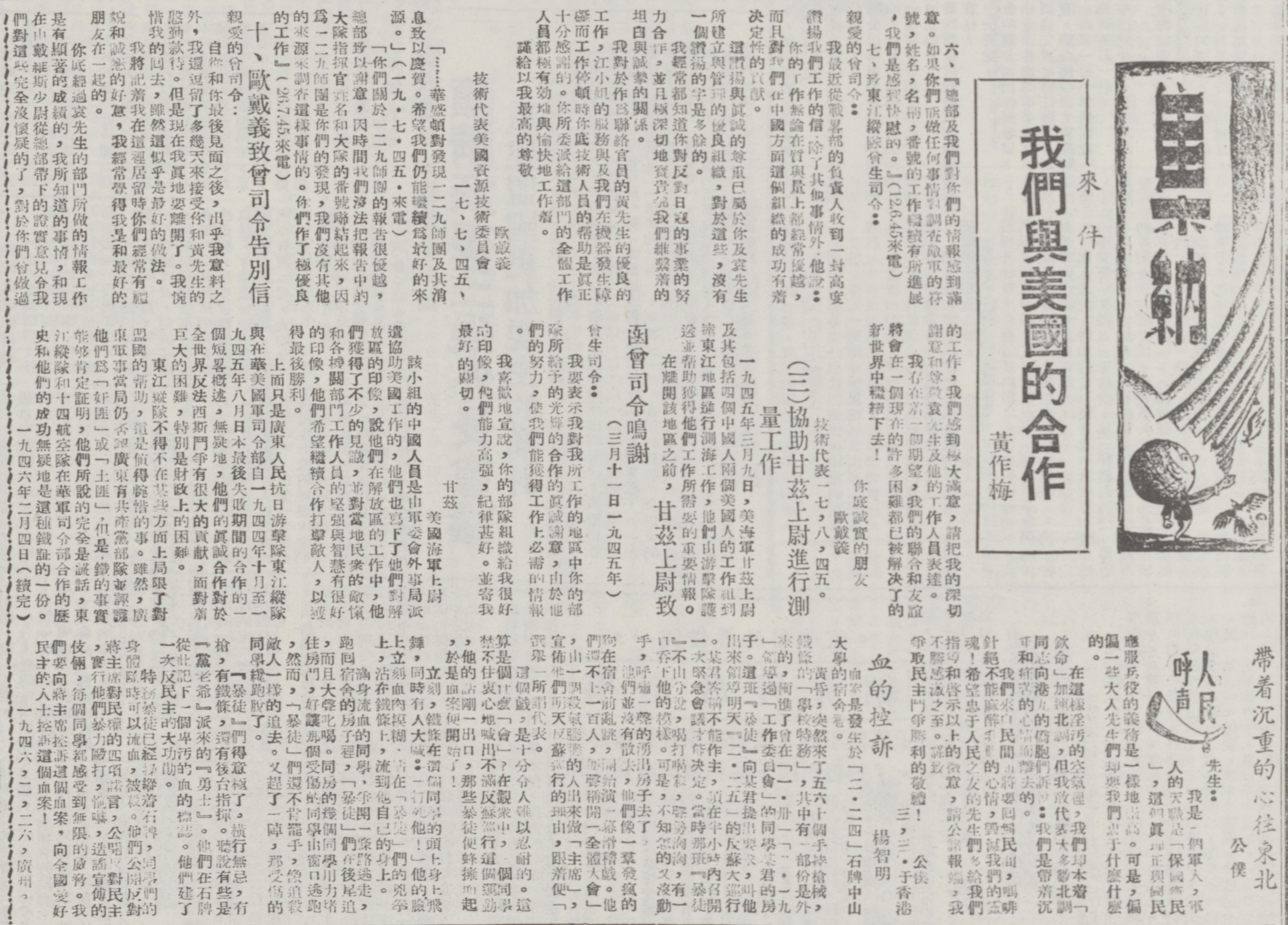 在省档案馆馆藏1946年3月《华商报》上,刊登了由港九大队联络员兼翻译黄作梅写的系列报道《我们与美国的合作》。从中,我们清晰可见美军一条关于情报工作的来电,“你们关于一二九师团的报告很优越,总部致以谢意”“因为一二九师团是你们的发现,我们没有其他的来源来调查这样事情的。你们作了极优良的工作”。这里面究竟隐藏着一个怎样的情报故事呢?
