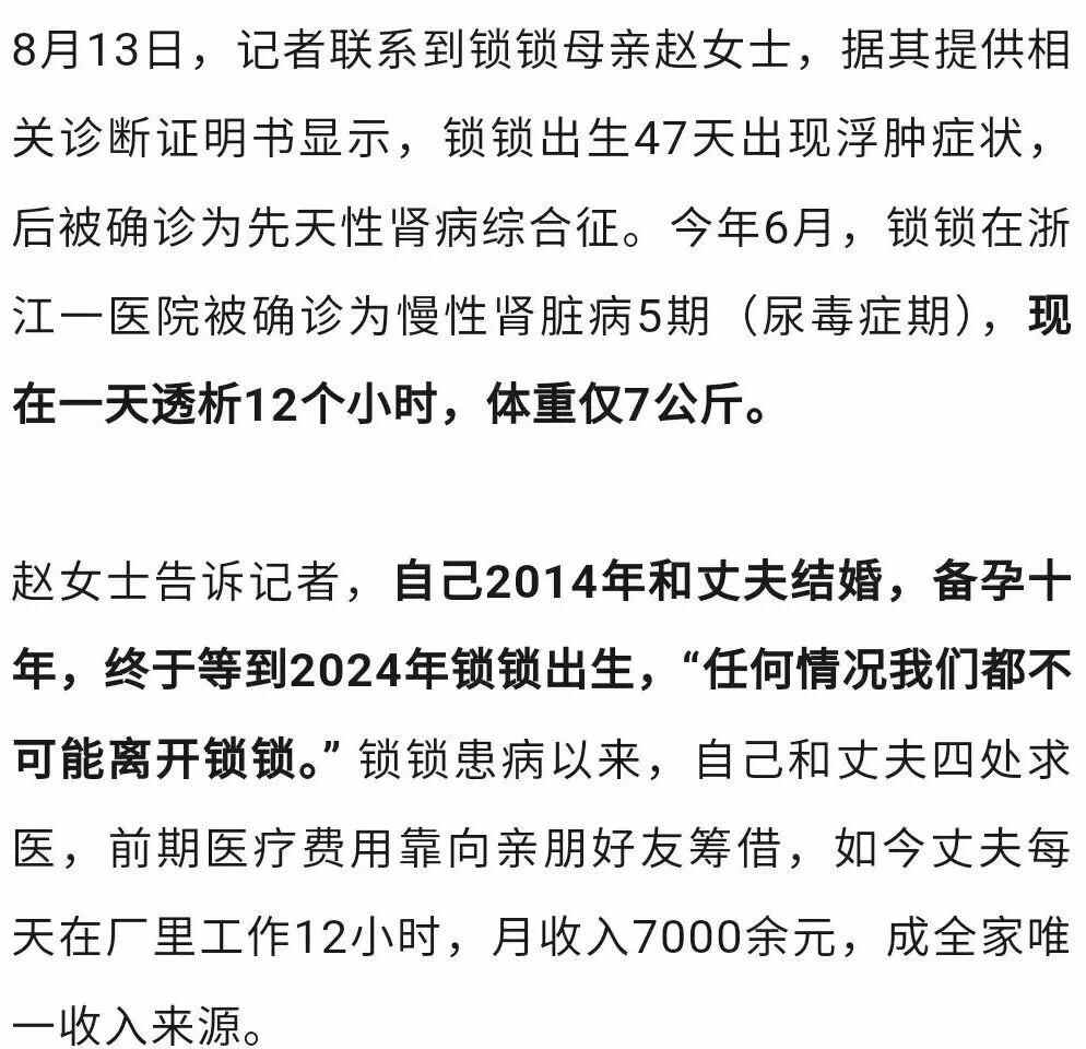 赵女士告诉记者,在社会各界爱心人士帮助下,锁锁医疗费用已筹得四万余元,待到手术费用筹齐,赵女士将带锁锁进行配型,等待肾移植手术。