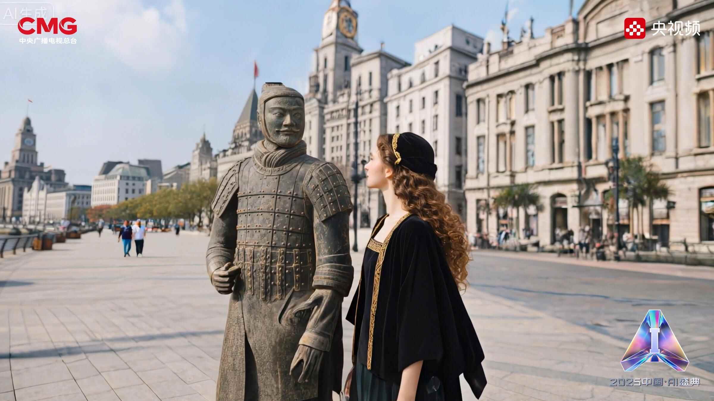 此外,即梦图片3.1模型、可灵2.1大模型等今年上线运行的AI工具将在短片《兵马俑世界奇遇记》中“大展身手”。短片通过多模态大模型动态合成兵马俑与蒙娜丽莎的拟真互动,包括细腻的表情变化和自然的舞蹈动作;同时结合神经渲染与场景重建技术,实现从秦陵到卢浮宫、再到上海外滩的无缝时空穿越。最终通过AI光影合成与风格迁移,将不同时代、不同艺术风格的画面统一为具有电影质感的视觉奇观,展现人工智能在创意内容生成与虚实融合领域的突破性应用,折射出文明对话的多种可能性。