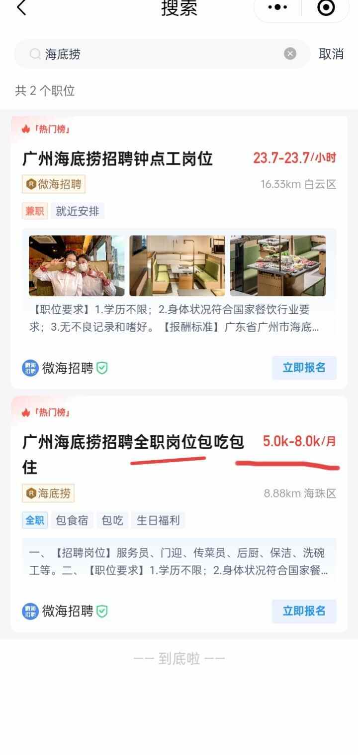 不过,在“微海招聘”看到,广州海底捞正在招聘“全职岗位”,薪资为5000到8000元。经与招聘人员核实,该岗位确实招聘“全职”,也是海底捞“正式员工”。但是,公司不会为新员工缴纳社保。“在职六个月以后可以买。”