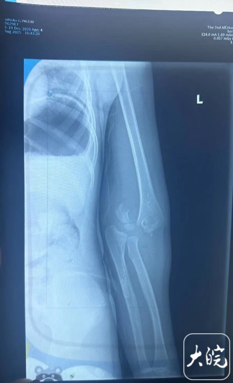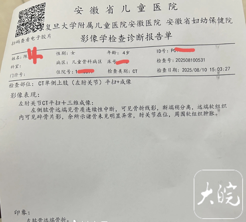随后陈先生也向记者展示了孩子入院后的诊断报告,“左侧肱骨远端见骨质连续性中断,可见骨折线影,断端稍分离,远端软组织内可见碎骨片影。”陈先生告诉记者,目前孩子已经完成手术,“这两天也在和儿童乐园方面协商解决此事。”