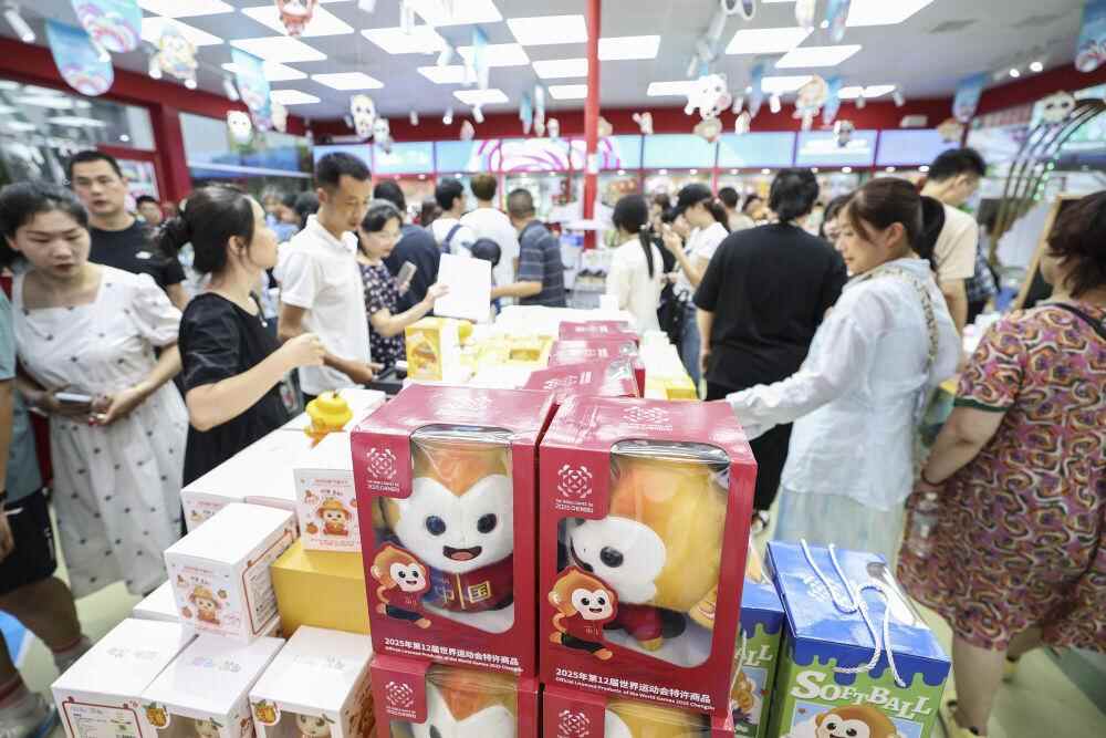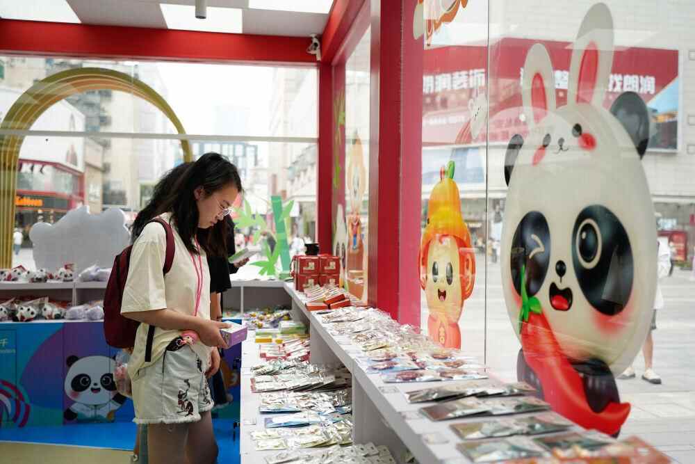 ↑7月8日,顾客在成都春熙路的一家世运会官方特许商品零售店选购。新华社记者 胥冰洁 摄