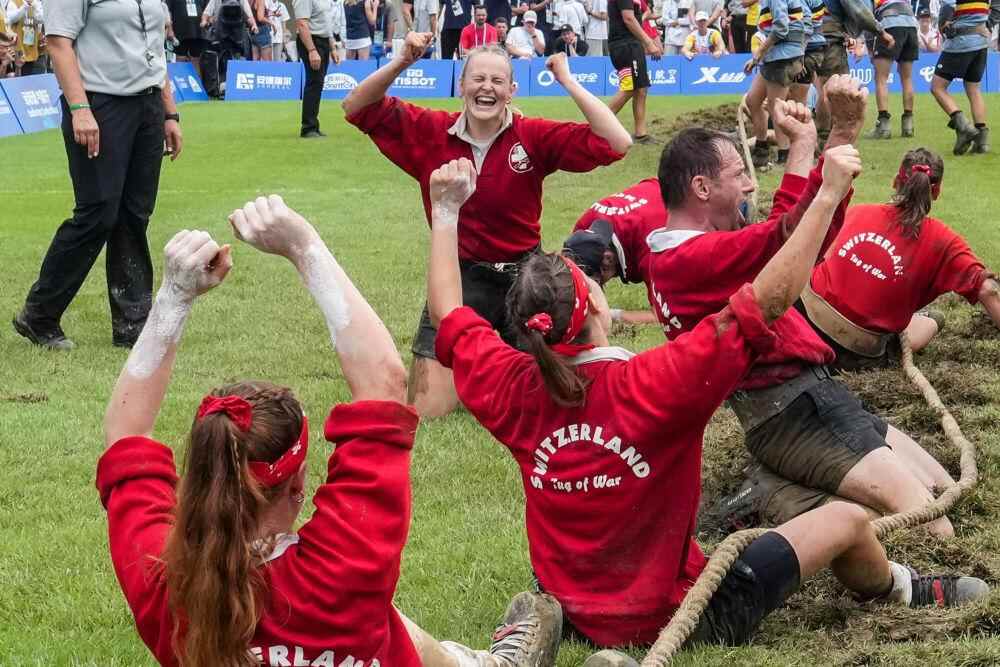 ↑8月11日,瑞士队队员在世运会混合室外拔河580公斤级赛后庆祝。新华社记者 李博 摄