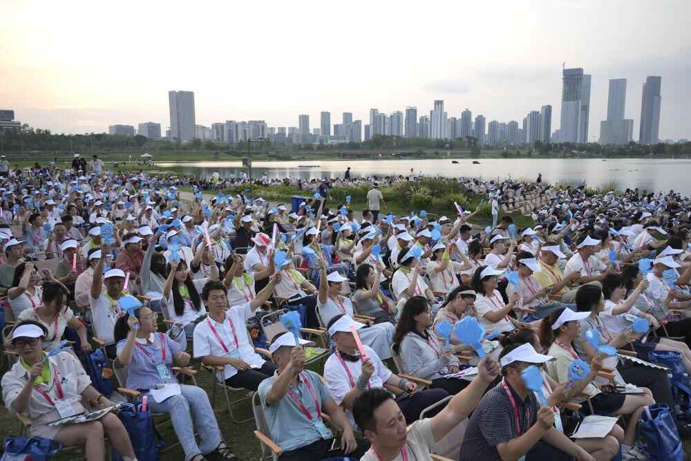↑8月7日,观众在世运会开幕式现场。新华社记者 徐速绘 摄