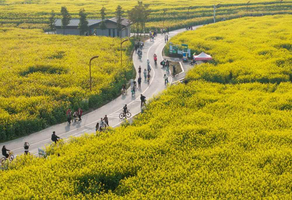 ↑3月13日,人们在成都高新区一处油菜花田旁骑行(无人机照片)。新华社记者 江宏景 摄
