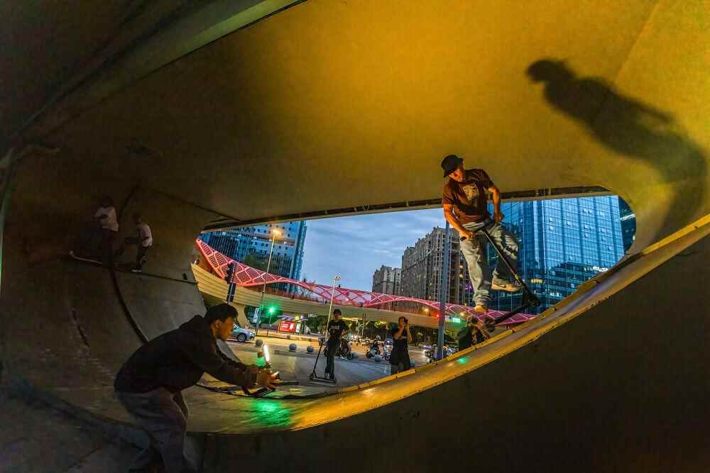 ↑2024年10月26日,爱好者在交子大道玩滑板车。新华社发