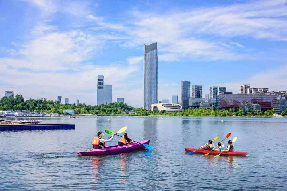↑7月26日,人们在成都市兴隆湖体验皮划艇。新华社发(张治平 摄)