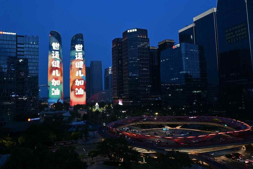 ↑这是8月7日拍摄的成都双子塔世运会主题灯光秀。新华社记者 杨文斌 摄
