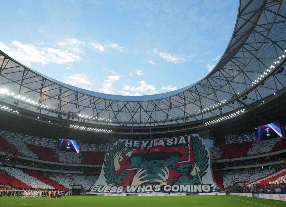 ↑8月12日,在亚冠附加赛现场,成都蓉城队球迷在赛前观众席上打出巨幅TIFO(可覆盖看台的大型横幅或拼图)。新华社记者 王曦 摄