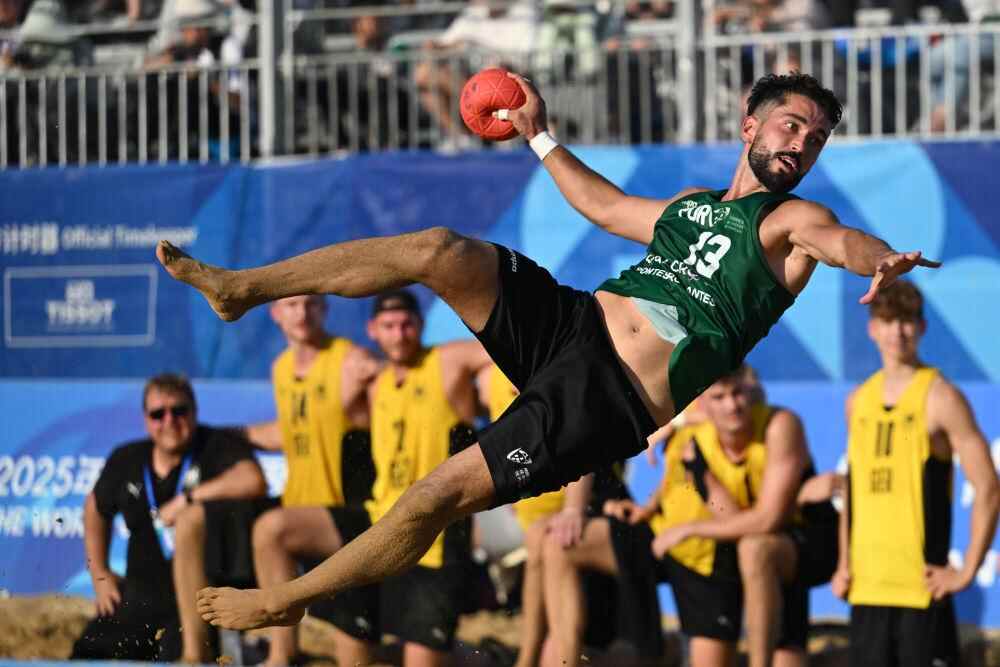 ↑8月12日,葡萄牙队球员科斯塔在世运会沙滩手球男子决赛中进攻。新华社记者 陈振海 摄