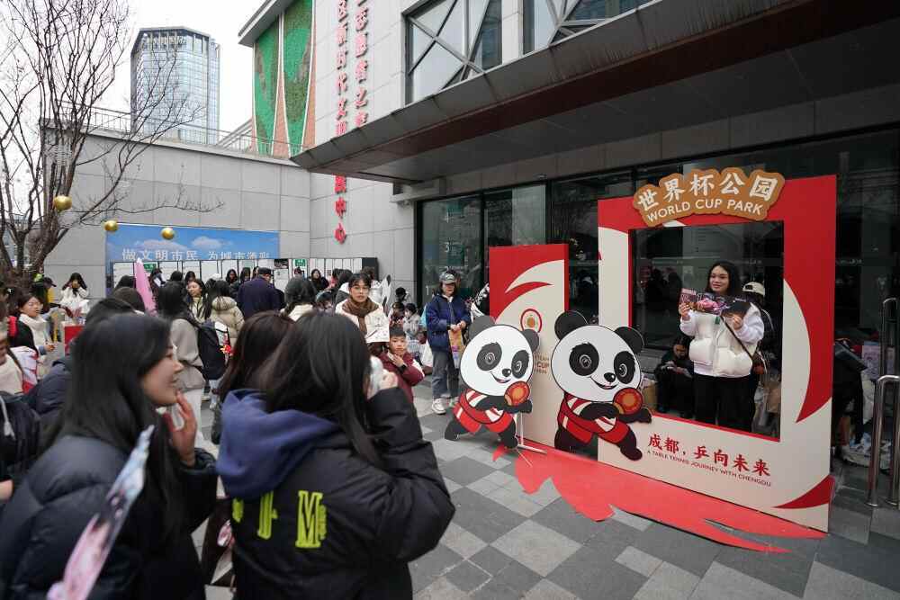 ↑2024年12月7日,球迷在成都2024乒乓球混合团体世界杯赛事景观旁合影。新华社记者 胥冰洁 摄