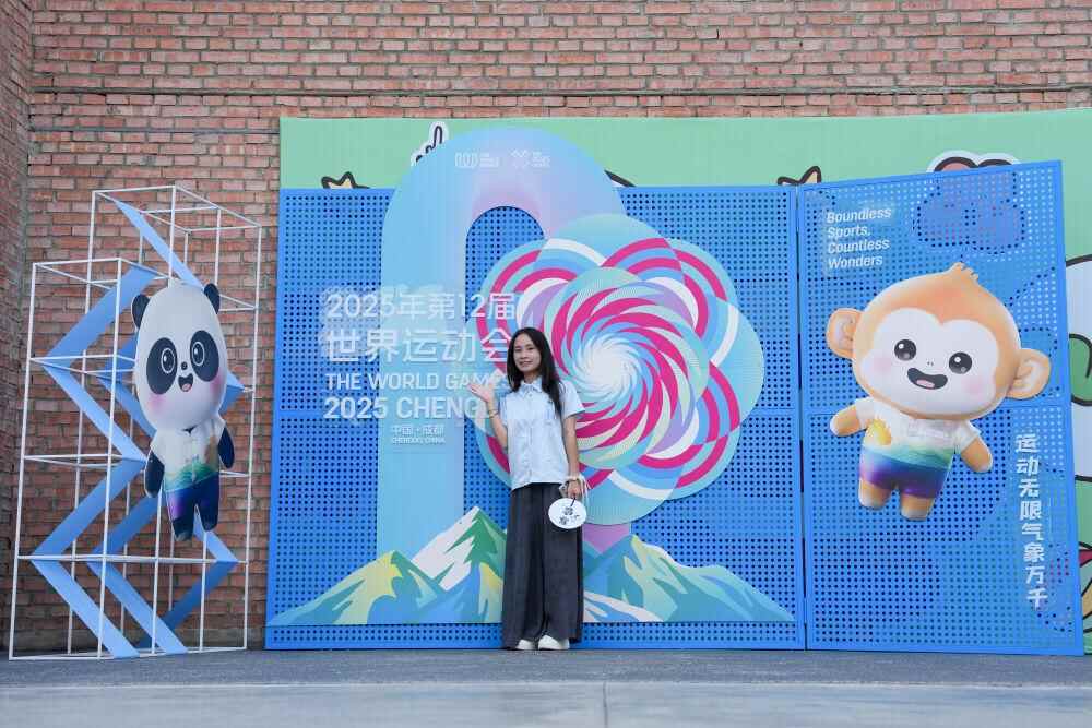 ↑8月7日,在成都东郊记忆·成都国际时尚产业园,游客在世运会主题展板前留影。新华社记者 李旭伦 摄
