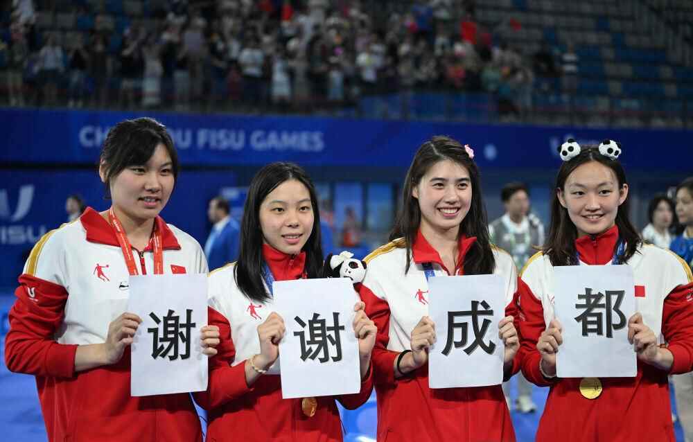 ↑2023年8月7日,在成都大运会游泳比赛现场,中国女子4x100米混合泳接力队手持“谢谢成都”标语合影。新华社记者 张龙 摄