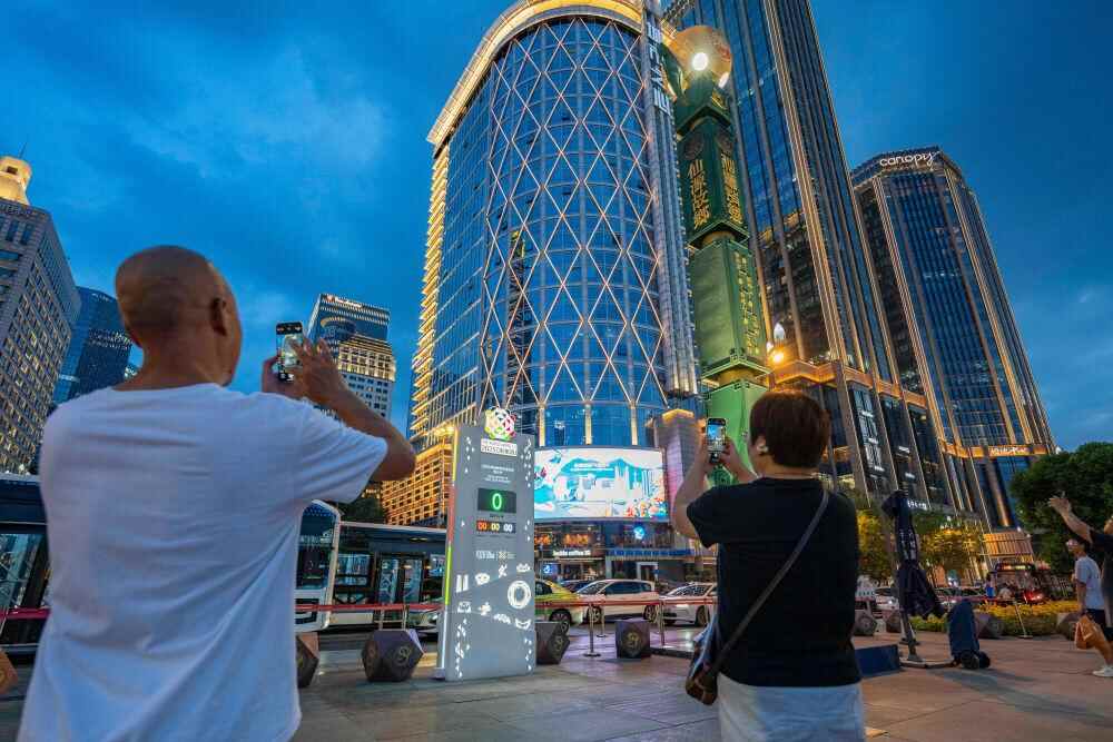 ↑8月7日,人们在成都天府广场上的世运会倒计时牌前拍照。新华社记者 谢剑飞 摄