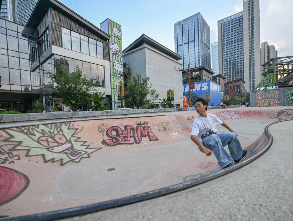 ↑8月6日,爱好者在成都东郊记忆户外滑板场练习滑板。新华社记者 王曦 摄