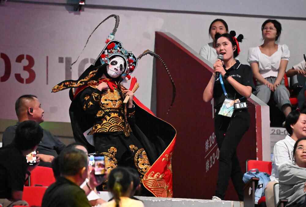 ↑8月10日,川剧变脸表演者在世运会蹦床比赛前暖场。新华社记者 孙凡越 摄