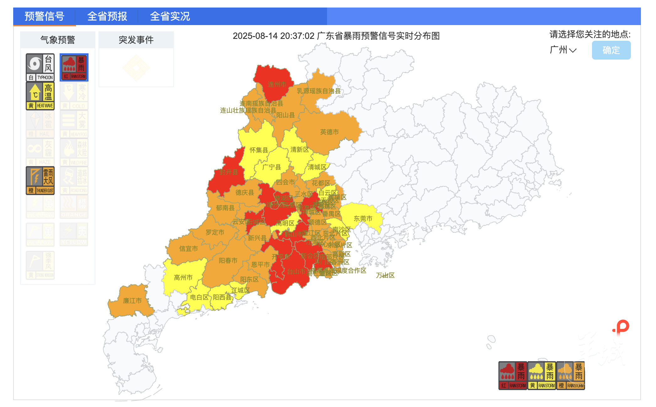 虽然“杨柳”中心已移出广东,但截至8月14日20时37分,广东中西部市县多地,仍然发布着暴雨预警信号。其中清远、肇庆、云浮、佛山、江门、珠海等地,有市县区正在发布暴雨红色预警信号。