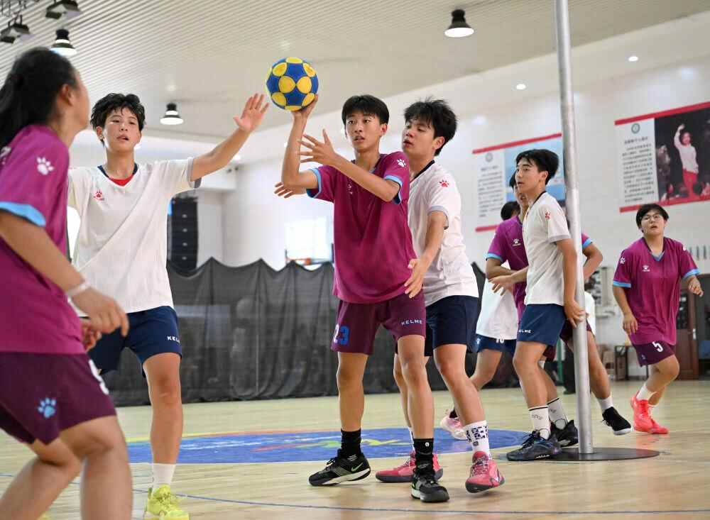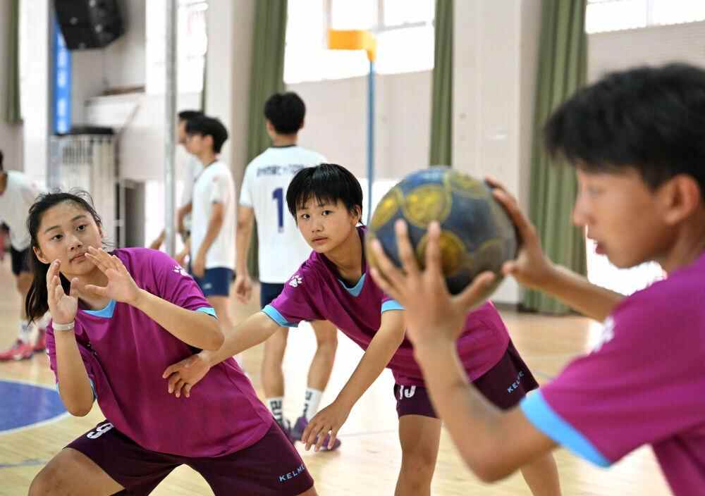 郑州市第七十六中学荷球队球员练习传接球。新华社记者 李嘉南 摄