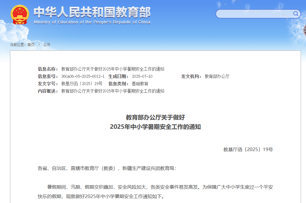 教育部办公厅关于做好2025年中小学暑期安全工作的通知(图片来源:教育部官网)