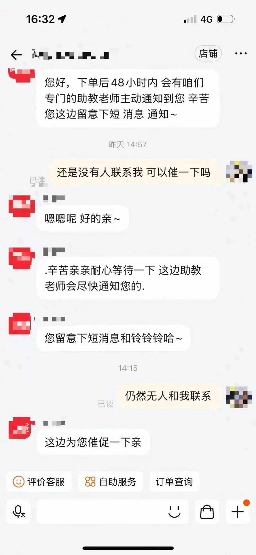 羊城晚报“记者帮”在淘宝、抖音、小红书等平台搜索“学情诊断规划”,发现仍然有在售的课程。记者以学生家长身份购买后,客服称后续收费情况会有专人48小时内与记者联系。但截至发稿,记者购买课程已超过两天,期间多次提醒催促,但仍未有人与记者联系。