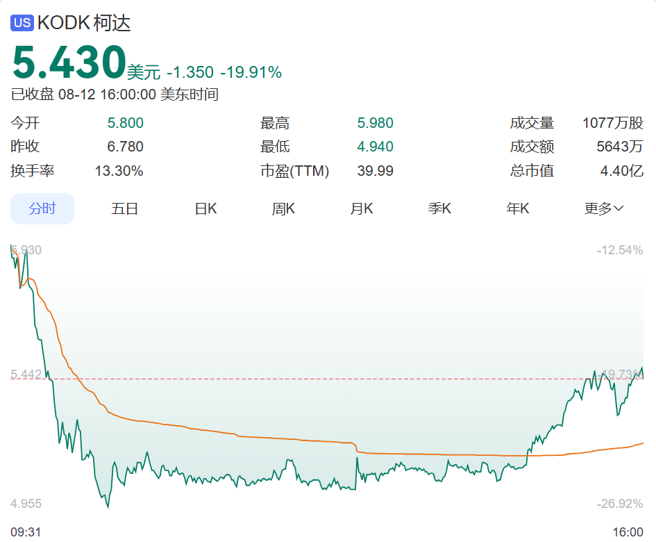 受此消息影响,当地时间12日,柯达股价一泻千里,一度跌超26%,截至收盘跌19.91%。