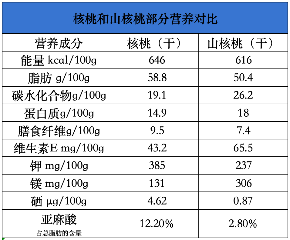 在营养上二者区别也不小,相比之下核桃的亚麻酸、膳食纤维、钾、硒含量较高,山核桃的蛋白质、维生素E、镁的含量较高。