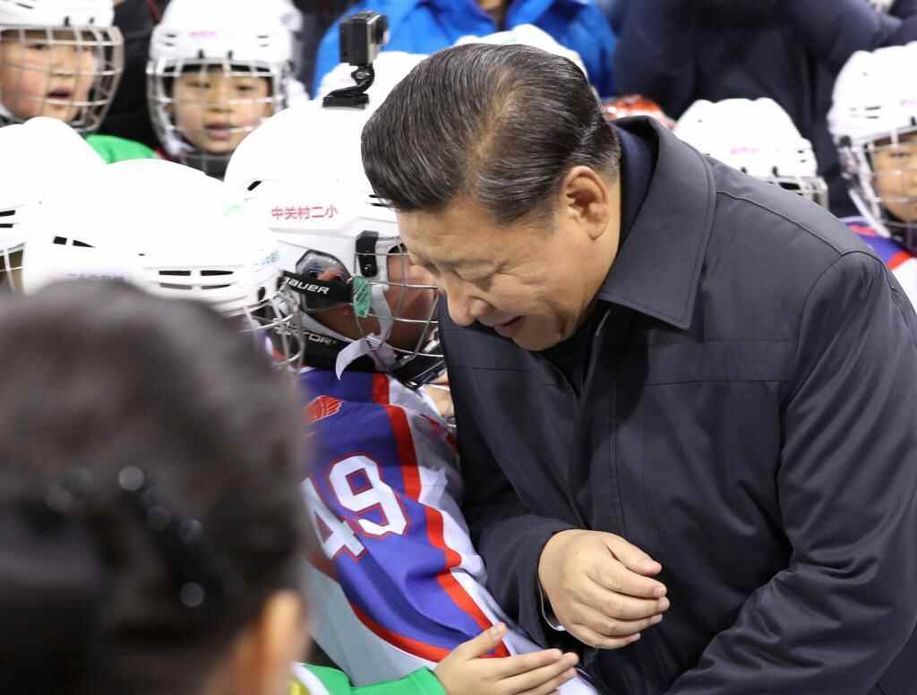 2017年2月,在北京五棵松体育中心,习近平总书记观看了青少年冰球训练和队列滑表演。总书记拉着一位小冰球队员的手,俯下身,以冰球运动员特有的问候方式,同他“撞肩”互动,笑着说,小伙子块头要再长大一点。