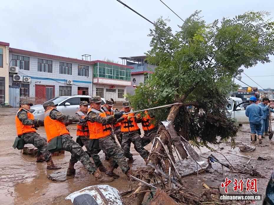 8月8日,武警甘肃总队机动支队官兵在甘肃省兰州市榆中县兴隆山村挪移损毁树木。