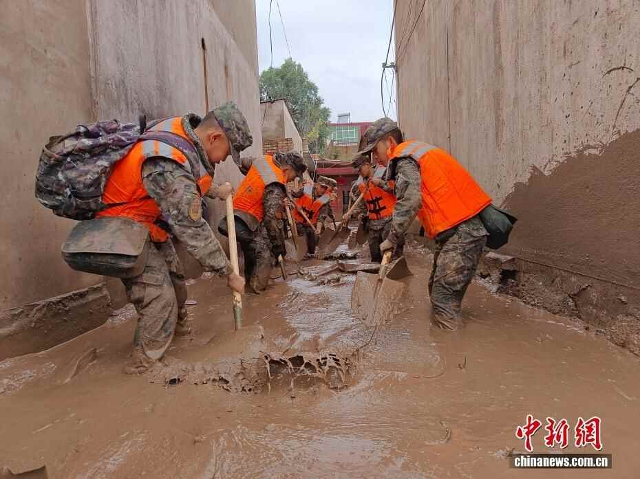 8月8日,武警甘肃总队机动支队官兵在甘肃省兰州市榆中县兴隆山村清理淤泥。