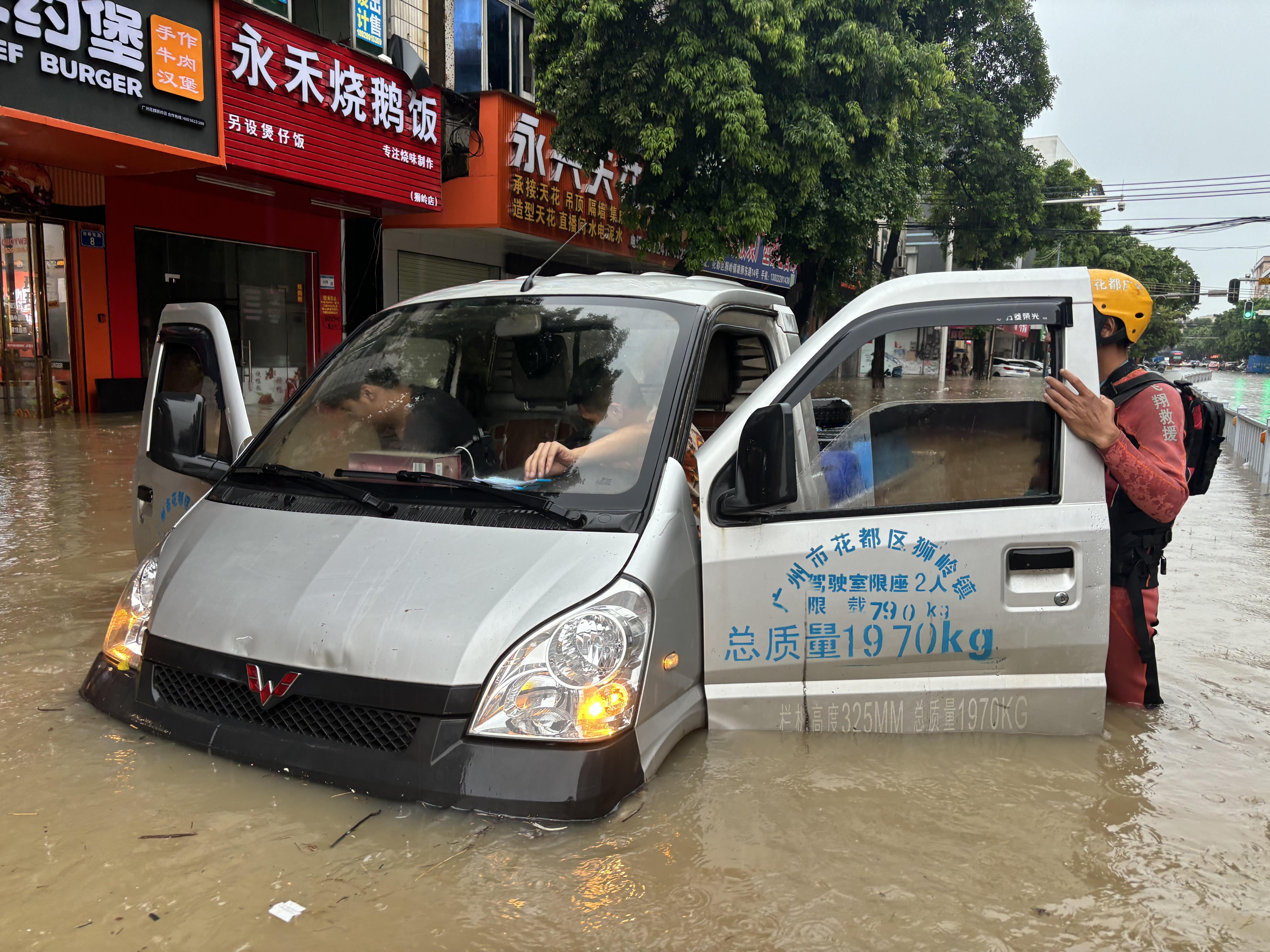 8月5日早上,广州市花都区防暴雨四级应急响应的警报拉响。广州市红棉老兵飞翔应急救援志愿服务队(以下简称“飞翔救援队”)立即进入应急状态,27名队员整装待发。午后雨势加剧,险情接踵而至:狮岭镇友田城地下车库严重进水、阳光路积水没过车轮、迳口村十多名群众被上涨的积水围困……