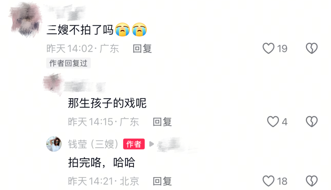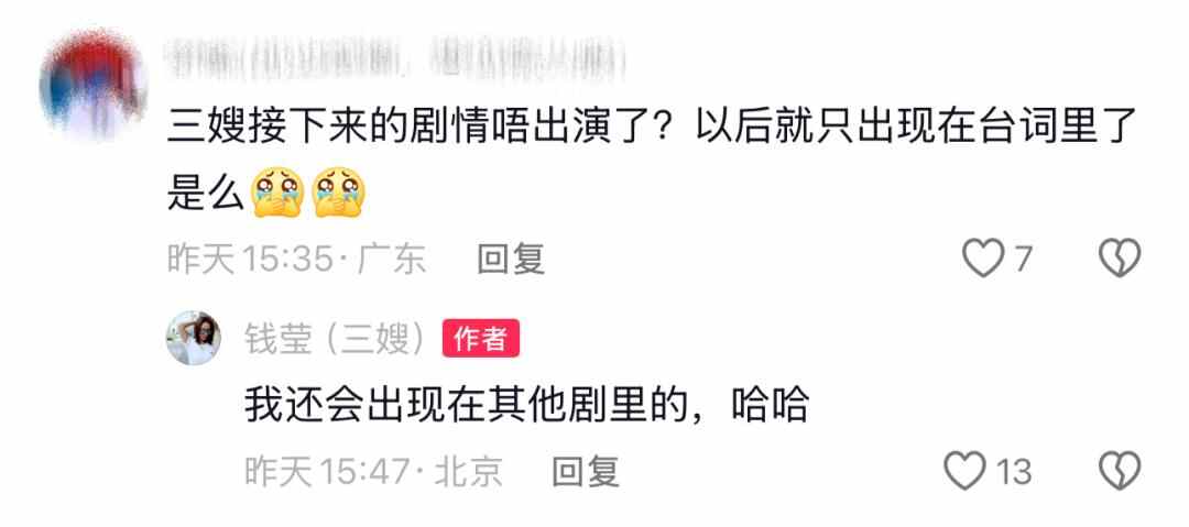 在钱莹评论区,《外来媳妇本地郎》的剧粉纷纷表达不舍,她也回复网友,并透露,自己已经拍完了生孩子的戏份,剧里三哥三嫂不会离婚。同时,钱莹也表示自己要去拍别的剧,希望和“家人们江湖再见”。
