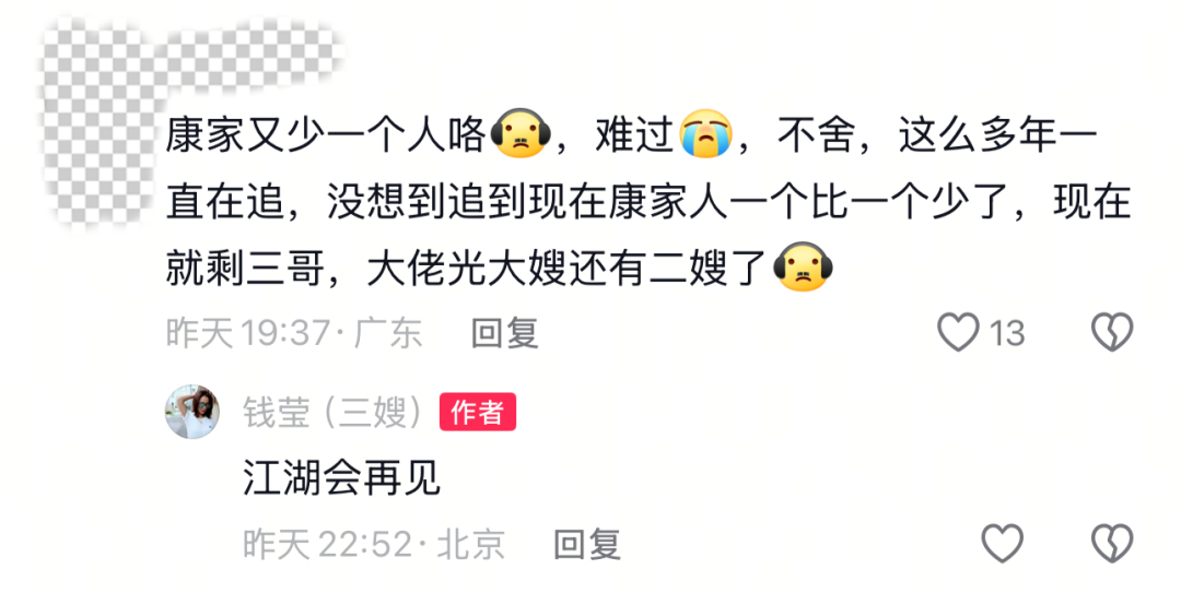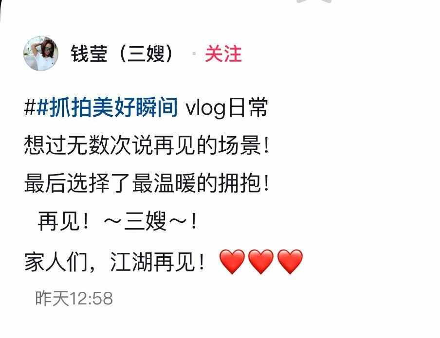 8月8日,广东人的回忆、粤产长寿情景喜剧《外来媳妇本地郎》中康家三嫂黄菲的饰演者钱莹在其短视频账号发了一条“告别”Vlog,她在发布文本里提到:“想过无数次说再见的场景,最后选择了最温暖的拥抱!再见!三嫂!家人们,江湖再见!”疑似将不再出演《外来媳妇本地郎》中“三嫂黄菲”一角。