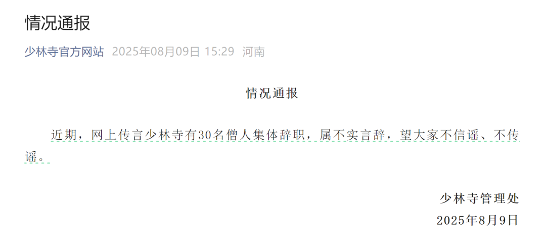 8月9日,少林寺管理处发布情况通报: