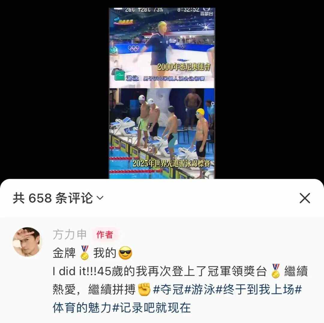 8月8日,方力申 出战在新加坡举行的世界先进游泳锦标赛,并以2分16秒84夺男子200米背泳45-49岁组别冠军。方力申在社交平台晒出自己的奖牌并称:I did it!!!45岁的我再次登上了冠军领奖台!继续热爱,继续拼搏。