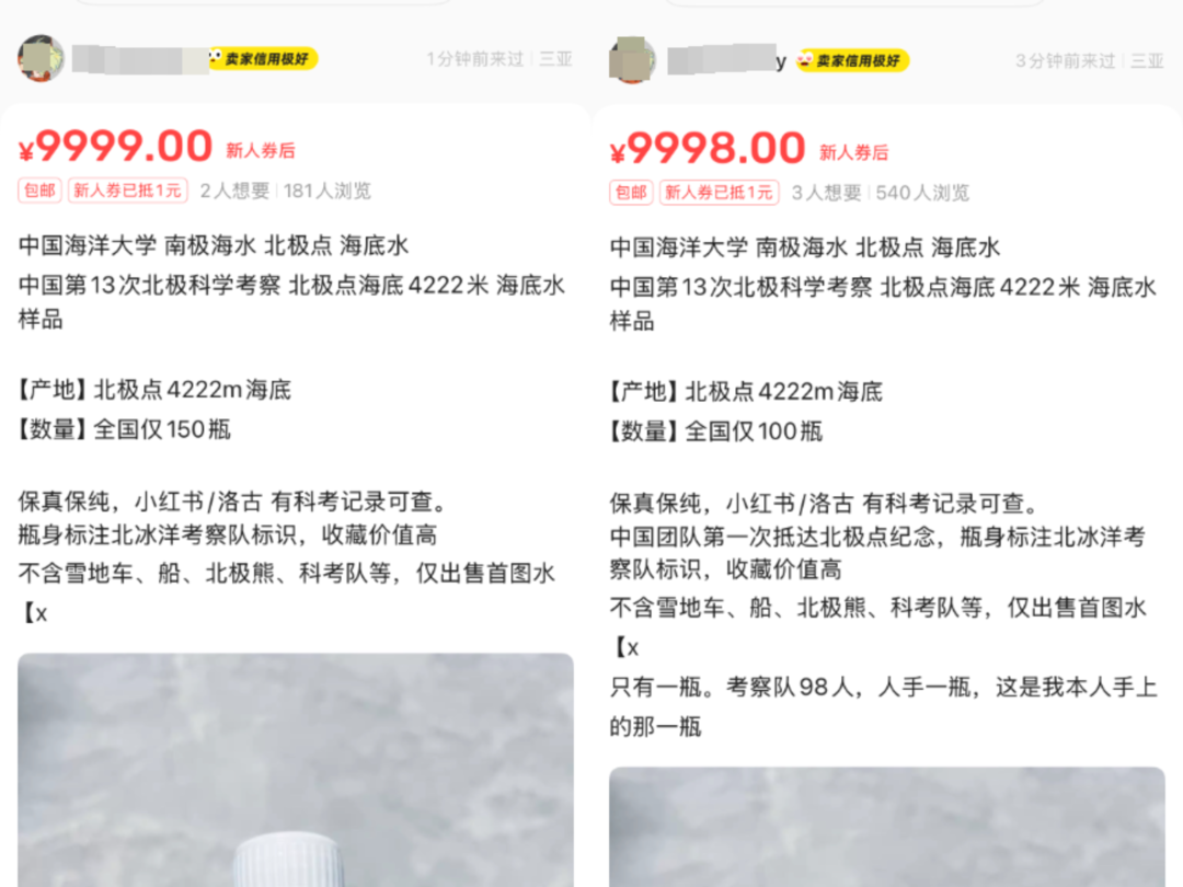 卖家称:所售样品为“北极点4222米海水,全国仅100瓶”