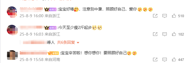 照片中全红婵身形显得更加清瘦,引发网友关切。大家纷纷留言为她加油鼓劲,并送上贴心提醒:“多喝水”、“注意防暑”、“别中暑了”。