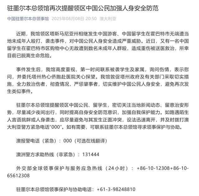8月8日晚,“中国驻墨尔本总领事馆”官微发文提醒领区中国公民加强人身安全防范:
